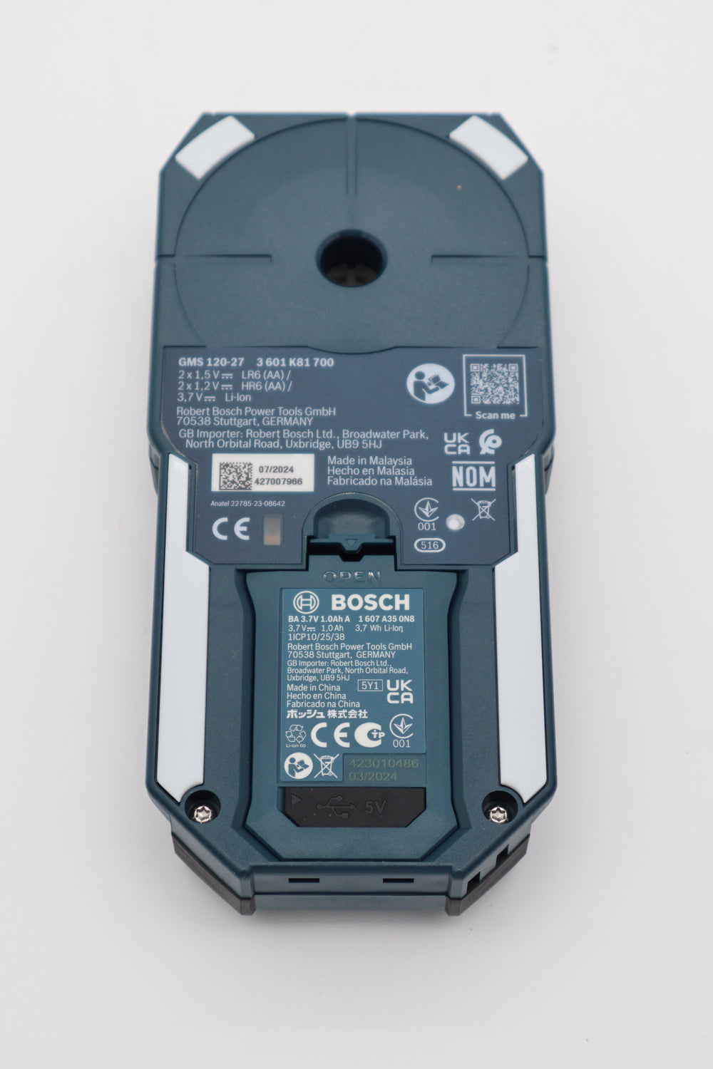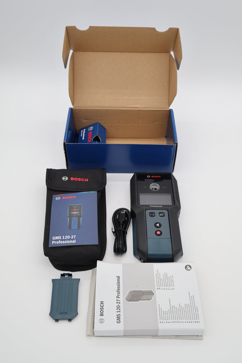 When drilling into the wall, you want to get the job done and make sure that you don’t encounter an obstacle. Our tracking device GMS 120-27 Professional allows an uncomplicated and intuitive location of objects. The location results are displayed by a signal indicator on the display and the colour-coded marking hole. The easy-to-use locator provides simple mode selection, and the marking hole allows you to mark exactly where objects have been located. The robust GMS 120-27 has been developed for rough construction sites and is equipped with dust and splash water protection according to IP54 and a shock-absorbing rubber housing.