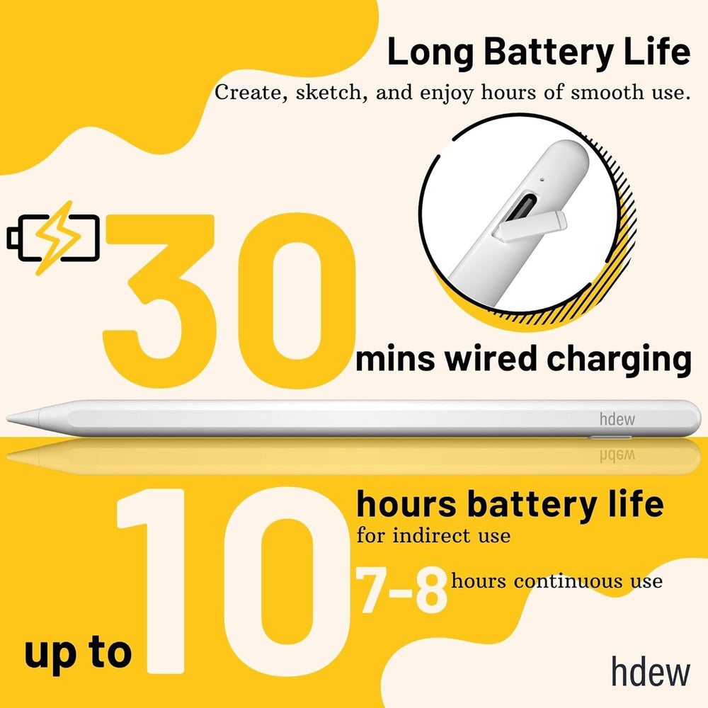HDEW's smart pen with 100mAh battery offers 7-8 hours of use. A digital pen and pen stylus for iPad with performance like the iPad A16 pen and iPad pencil 11th generation.