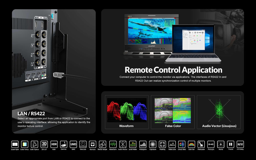 With other features such as REC. 709 and DCI-P3 Colour Space, 3D LUT Support, Remote Control through LAN connection, Multiview and Quad-Split, and an optionally purchased 12G-SFP connection - the Q18-8K packs massive value monitoring into an easy-to-operate system.