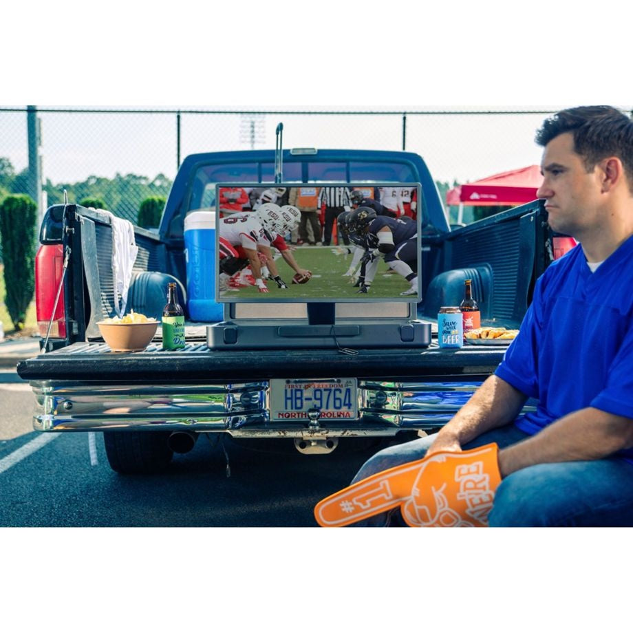 The case folds up and transports like a suitcase, making PixCase easy to store and quick to set up. Laptops, consoles, and smartphones can be connected via HDMI, USB-A, and USB-C. The USB-C port also supports pass-through charging for external devices.