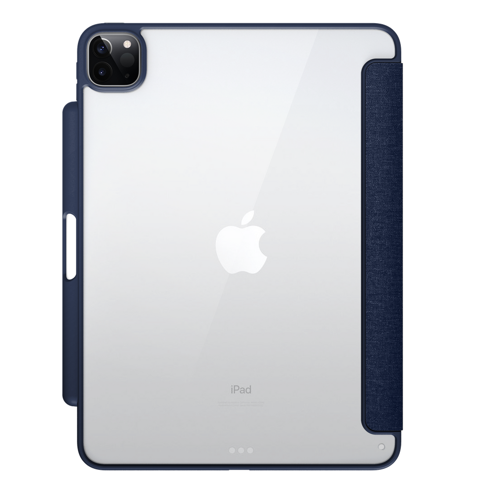 MUSE is a premium multi-angle folio case featuring a transparent back and stylish woven, water-resistant front cover. The tri-fold design can easily fold into different positions to create a perfect stand for reading, viewing, typing or making FaceTime calls. This case offers optimal protection: with shock absorbent edges, polycarbonate, rigid back and microfibre inner lining helping prevent scrapes and scratches. The crystal clear back allows you to display your iPad, its colour and any engraved customisations whilst also protecting it from damage. MUSE automatically wakes your iPad when opened, and puts it to sleep when closed, helping preserve battery life. With built-in Apple Pencil holder, keeping it secure on the move and conveniently charged.