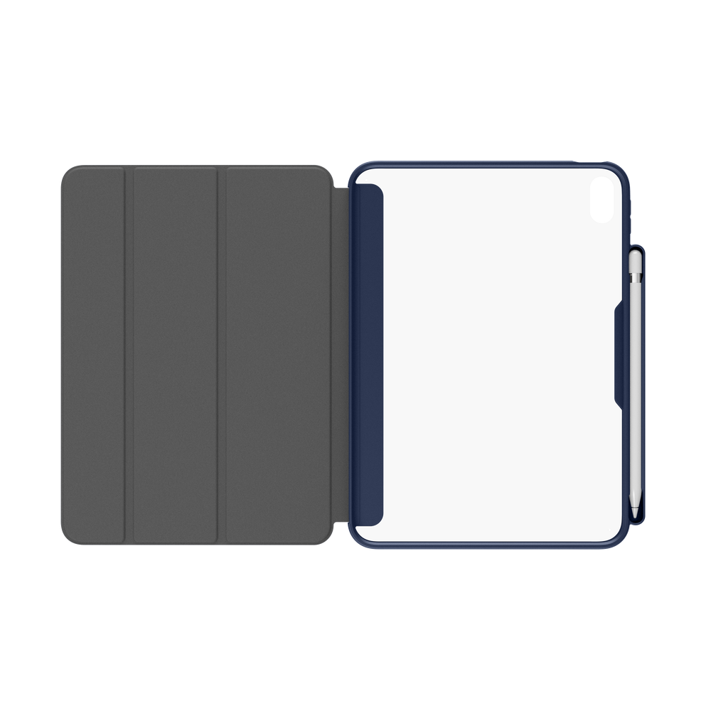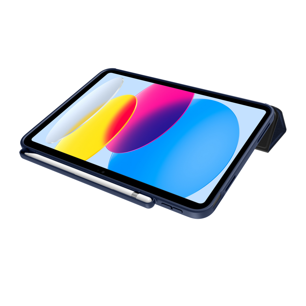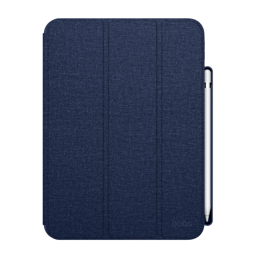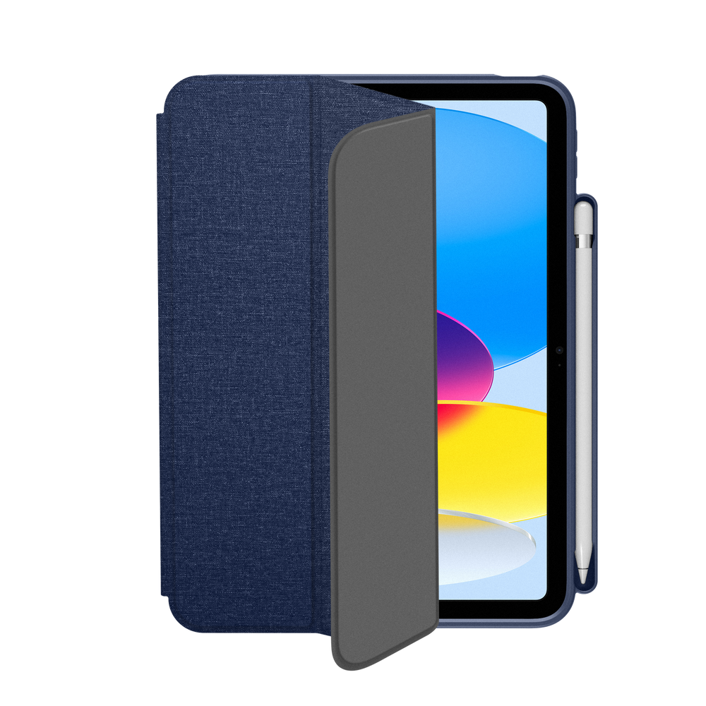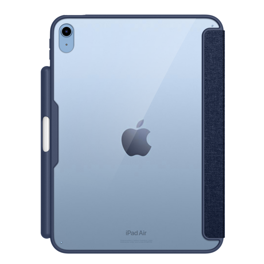 MUSE is a premium multi-angle folio case in blue, featuring a transparent back and stylish woven, water-resistant front cover. The tri-fold design can easily fold into different positions to create a perfect stand for reading, viewing, typing or making FaceTime calls. This case offers optimal protection: with shock absorbent edges, polycarbonate, rigid back and microfiber inner