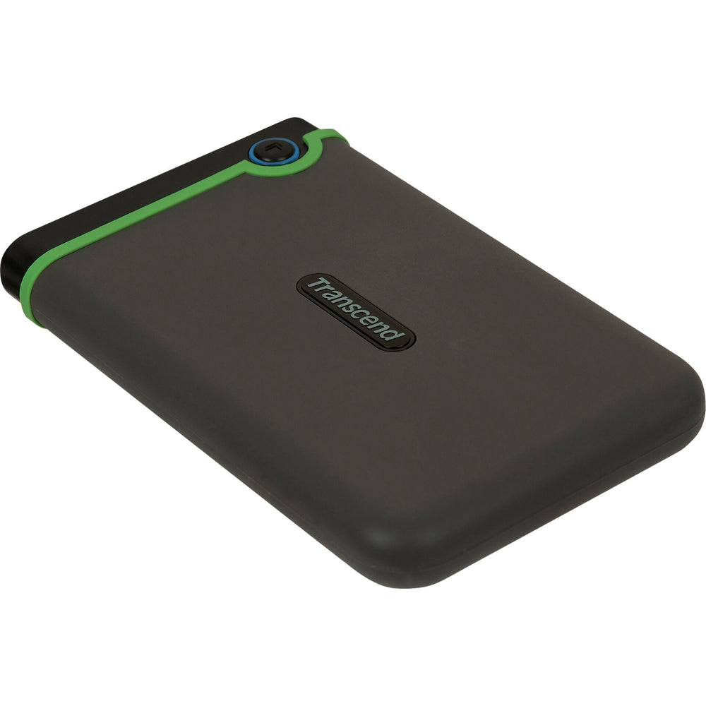 The iron gray 2TB StoreJet 25M3 Anti-Shock External Hard Drive from Transcend is a durable portable storage drive boasting USB 3.0 connectivity. USB 3.0 allows data transfers as fast as 5 Gbps, more than five times faster than USB 2.0. The drive is fully compatible with the USB 2.0 standard as well, ensuring connectivity with older devices.